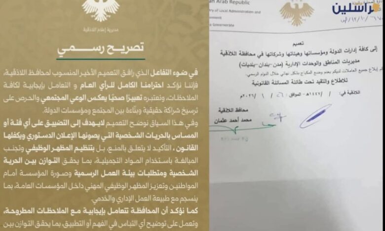 في خضم هذا الجدل، أصدرت مديرية الإعلام في محافظة اللاذقية توضيحاً أكدت فيه احترامها للرأي العام وتعاطيها الإيجابي مع مختلف الملاحظات، معتبرة أن النقاش الدائر حول التعميم يعبر عن حالة وعي مجتمعي وحرص على بناء شراكة حقيقية بين المواطنين ومؤسسات الدولة.
