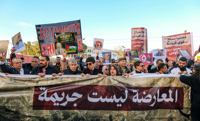 وخلال المظاهرة، رفع المحتجون لافتات كُتب عليها: “المعارضة ليست جريمة” و “الحرية لتونس”، إلى جانب صور العشرات من القادة والنشطاء المعتقلين.