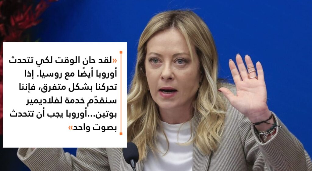 من جهتها ذهبت رئيسة الوزراء الإيطالية جورجيا ميلوني إلى الحديث عن ضرورة التفكير في استئناف الحوار، إذ صرحت بأن «الوقت قد حان لكي تتحدث أوروبا أيضا مع روسيا»، مع تأكيدها في الوقت نفسه أن أي خطوة من هذا النوع يجب أن تتم بشكل موحد. وأضافت محذرة: «إذا ذهبنا للتواصل مع روسيا في شكل متفرق، فإننا سنقدّم خدمة إلى فلاديمير بوتين، وهذا آخر ما نريده». كما دعت إلى تعيين مبعوث أوروبي خاص يعبر عن موقف واحد، معتبرة أن وحدة الصوت الأوروبي شرط أساسي لأي دور فعال في مسار التفاوض.