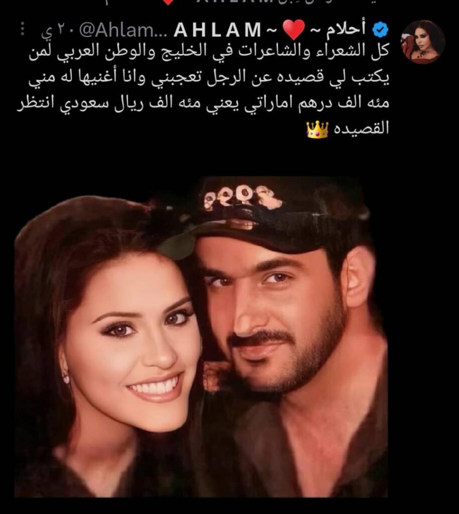 وجاء في التغريدة التي نشرتها أحلام مرفقة بصورة لها مع زوجها مبارك الهاجري: “لكل الشعراء والشاعرات في الخليج والوطن العربي، من يكتب لي قصيدة عن الرجل تعجبني، سأغنيها له، ومني مئة ألف درهم إماراتي، يعني مئة ألف ريال سعودي. أنتظر القصيدة.”