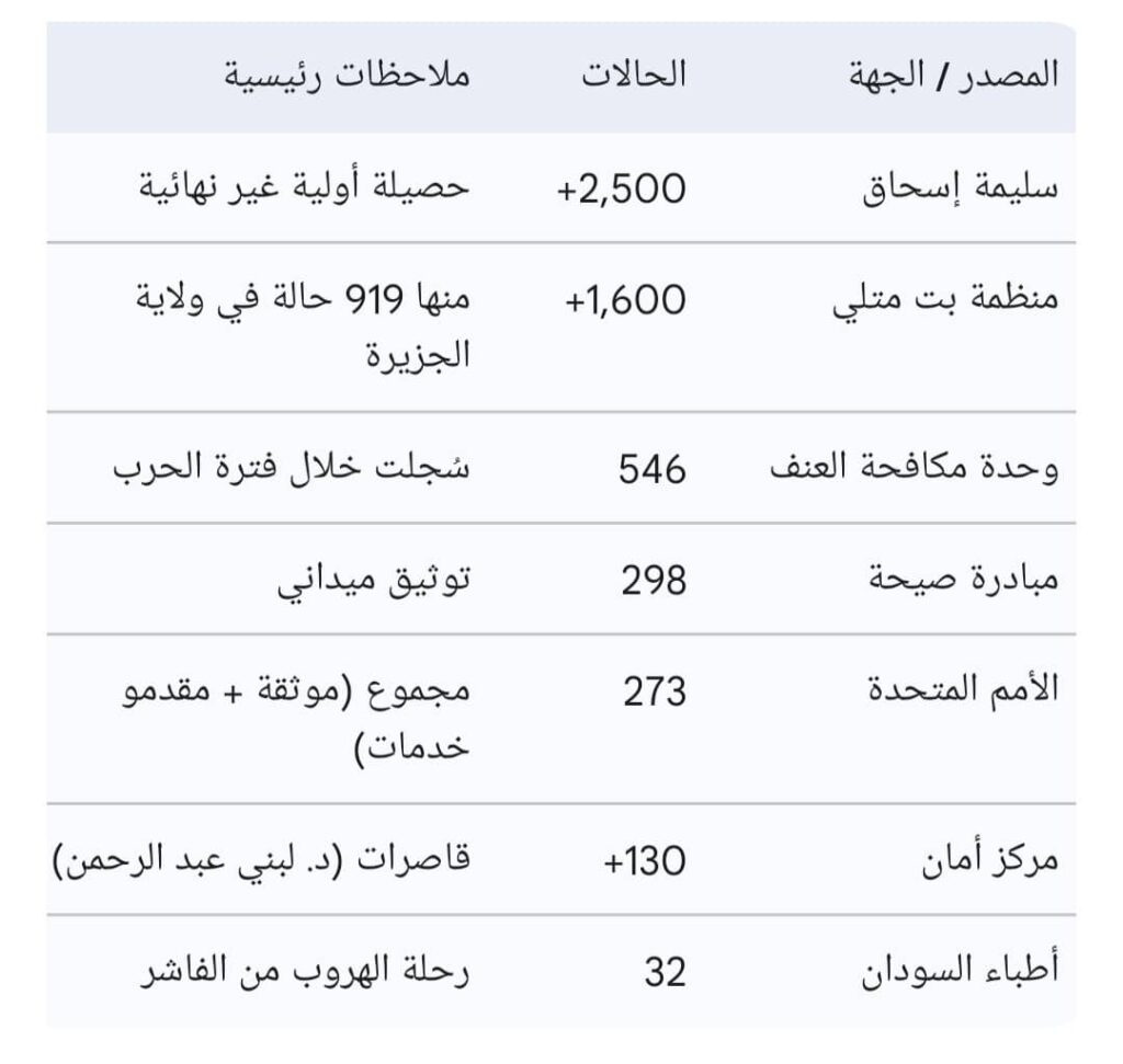 هذا ما استطعنا ان نتحصل عليه من تقارير سابقة تخص هذه القضية منذ بداية الحرب الى التصريح الذي كشفت فيه وزير الرعاية الاجتماعية السودانية د. سليمى إسحاق الذي يشتمل على أكثر من (2500) حالة ، وتعتبر هذه الحصيلة غير نهائية .