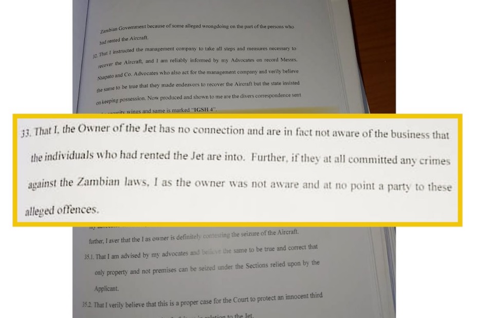 وفي الإفادة الخطية، ينفي العرجاني هو وشركة إدارة الطائرة إيبيس إير، أي صلة لهما بالمصريين الذين استأجروا الرحلة من القاهرة إلى لوساكا.