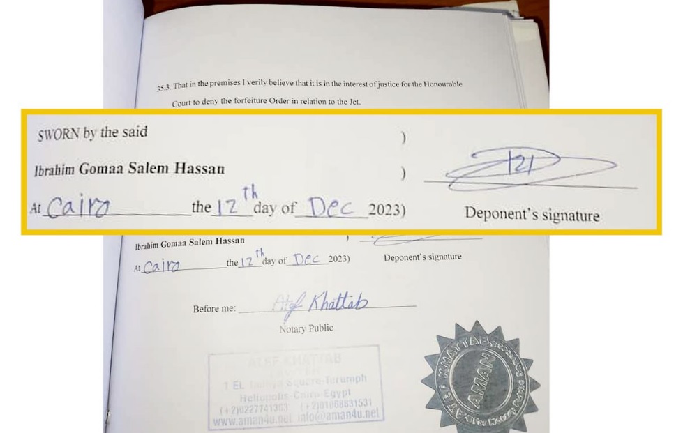 الوثائق التي حصلت عليها الشبكة بالتعاون مع مؤسسة “مكافحة الجريمة المنظمة والفساد (OCCRP)، أوضحت أن العرجاني قدم إفادة خطية إلى المحكمة العليا في زامبيا في ديسمبر 2023، وعرّف نفسه بأنه مالك الطائرة.