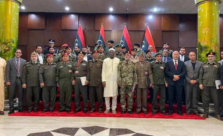 واتفق المجتمعون -حسب البيان- على الالتزام الكامل بكل ما نتج عن الحوار بين اللجنة العسكرية المشتركة 5+5 والقادة العسكريين والأمنيين في اجتماعي تونس وطرابلس.