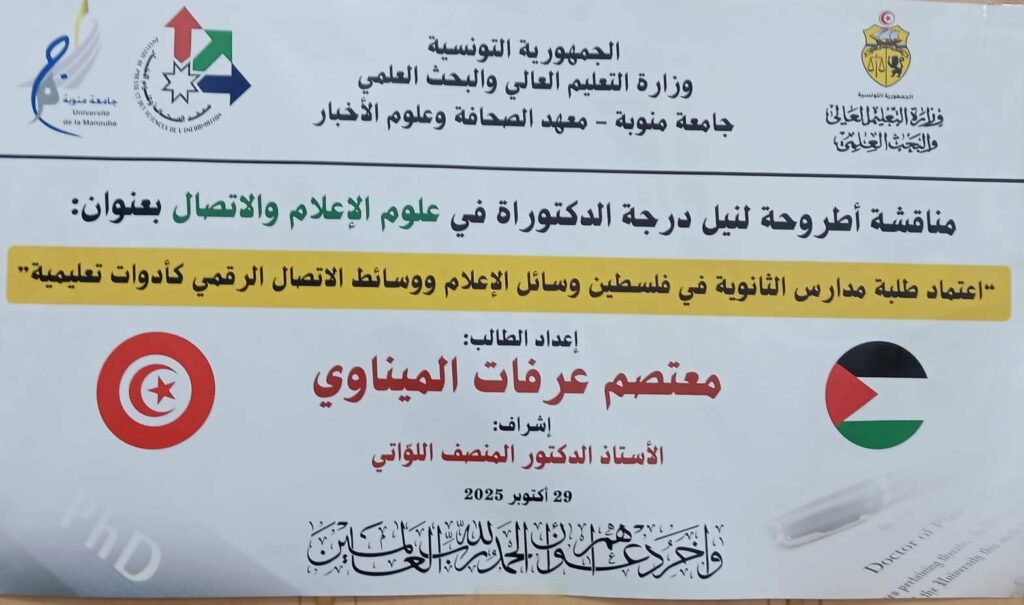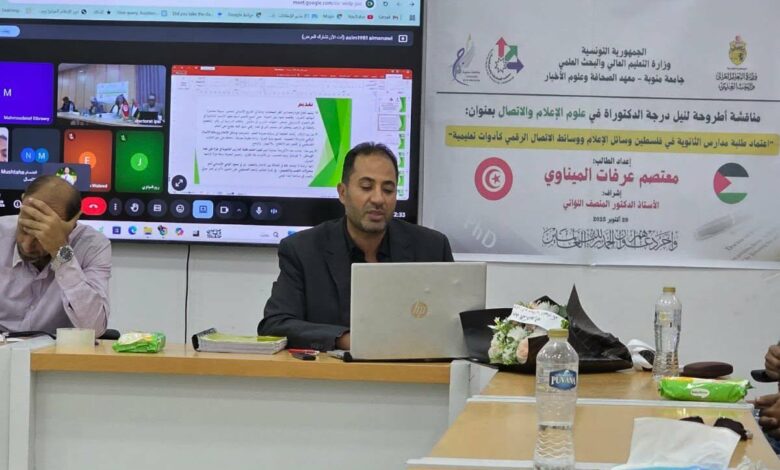 حصل معتصم عرفات الميناوي من قطاع غزة على درجة الدكتوراة بعد مناقشة أطروحته في علوم الإعلام والإتصال من معهد الصحافة وعلوم الأخبار بجامعة منوبة التونسية، عن بُعد، وسط الدمار والتجويع والنزوح الذي خلّفه العدوان الإسرائيلي المستمر على القطاع, في مشهدٍ غير مألوف يعكس صمود الإنسان الفلسطيني أمام أقسى الظروف.