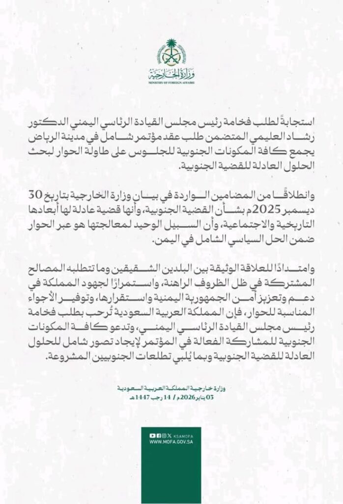 وقالت وزارة الخارجية السعودية، في بيان رسمي، إن المملكة تدعو “كافة المكونات الجنوبية للمشاركة الفاعلة في المؤتمر، من أجل التوصل إلى تصور شامل لحلول عادلة للقضية الجنوبية، وبما يلبي تطلعات الجنوبيين المشروعة”.