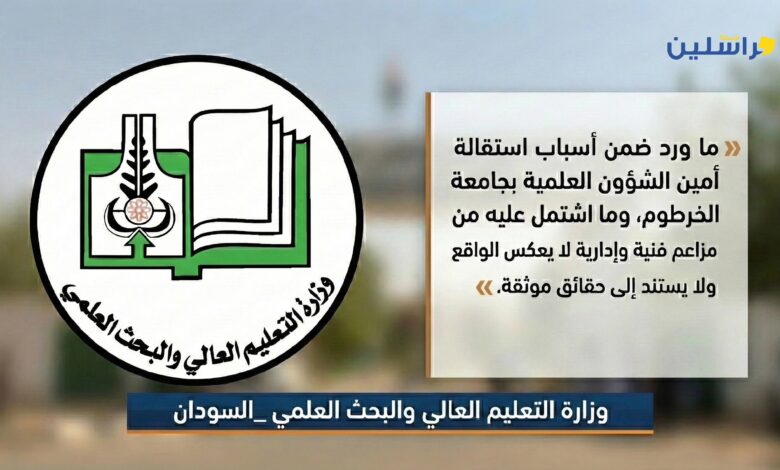 وأكد البيان أن الوزارة تابعت ما ورد ضمن أسباب استقالة أمين الشؤون العلمية بجامعة الخرطوم، وما اشتمل عليه من مزاعم فنية وإدارية، معتبرة أنها لا تعكس الواقع ولا تستند إلى حقائق موثقة.وأوضح البيان أن تأمين قواعد البيانات الوطنية يمثل إجراءً سياديًا لحماية حقوق الطلاب والخريجين، لا سيما بعد الأضرار التي لحقت بعدد من مؤسسات التعليم العالي جراء التخريب.