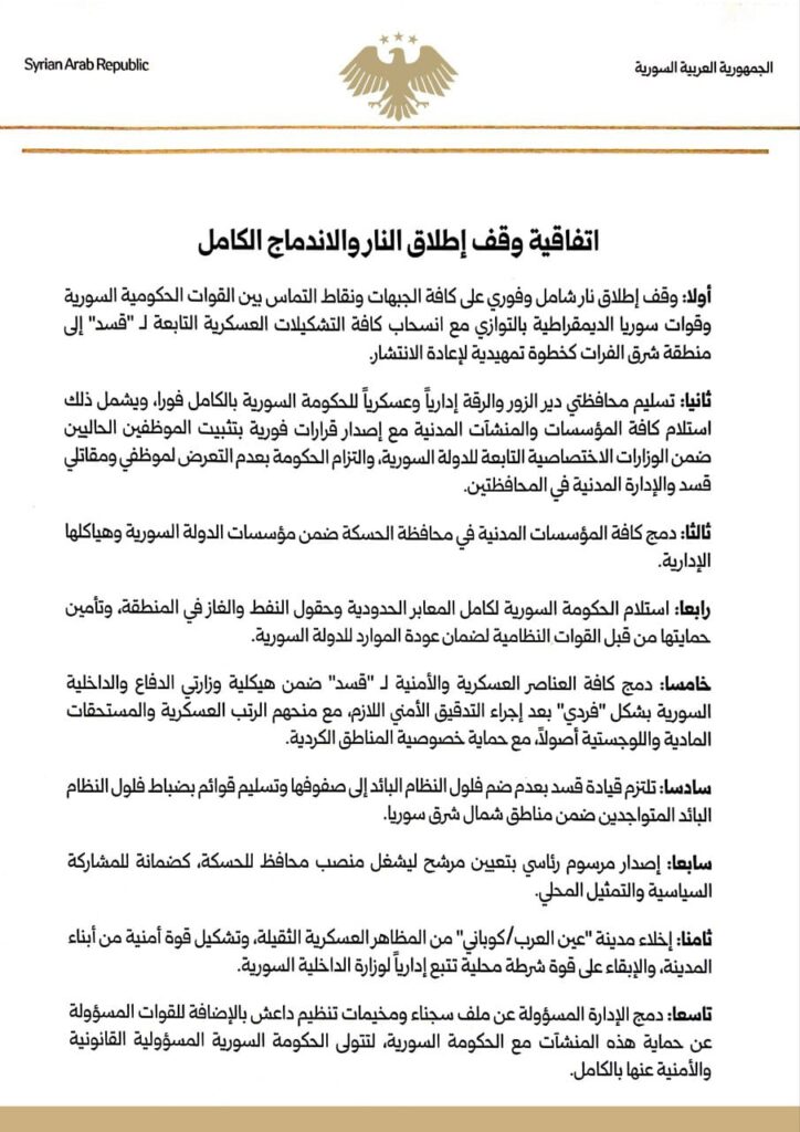 الرئيس السوري يعلن اتفاق وقف إطلاق النار مع قسد ويؤكد اندماجها الكامل في المؤسسات والجيش