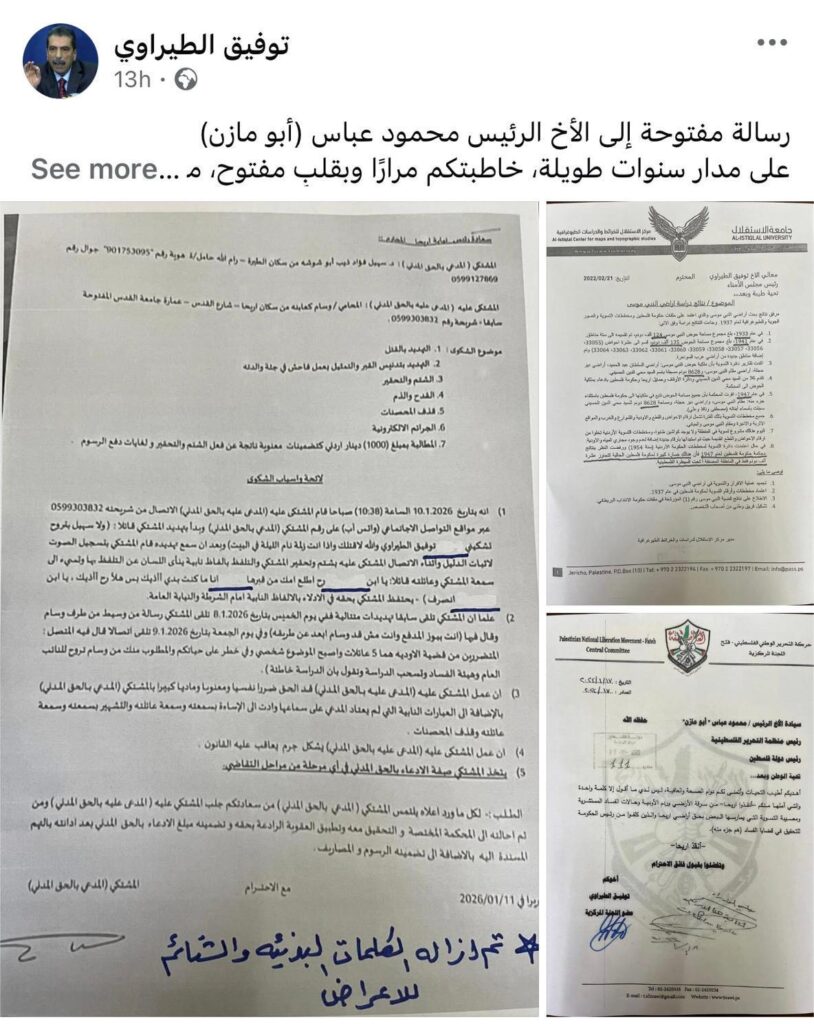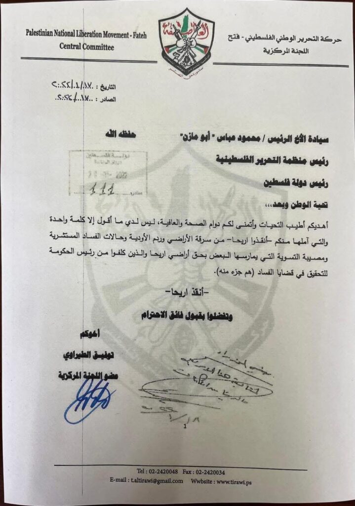 في رسالة غير مسبوقة بعث بها عضو اللجنة المركزية لحركة فتح توفيق الطيراوي ونشرها على صفحته على الفيسبوك اليوم إلى رئيس السلطة الفلسطينية محمود عباس، فجر اتهامات خطيرة تتعلق بتفشي الفساد والنهب والترهيب داخل مؤسسات السلطة. مؤكدا أن هذه الممارسات وصلت إلى الاستيلاء المنظم على الأراضي والأملاك العامة والخاصة، في ظل غياب المساءلة وتراجع دور القضاء.