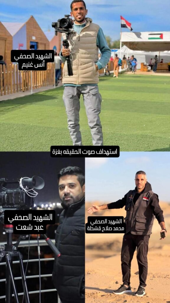 قطاع غزة – استهدف الجيش الإسرائيلي مساء اليوم مركبة تابعة لطاقم صحفي من طواقم اللجنة المصرية أثناء تأديتهم لعملهم في تغطية الأوضاع الإنسانية والتصوير داخل القطاع وأسفر الاستهداف عن استشهاد الصفحي عبد الرؤوف شعت، والصحفي محمد صلاح قشطة، والصحفي أنس غنيم، في انتهاك صارخ لكافة القوانين الدولية والإنسانية .