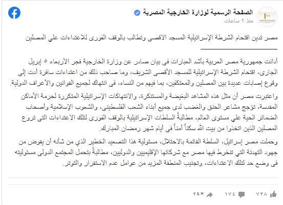 أدانت جمهورية مصر العربية بأشد العبارات في بيان صادر عن وزارة الخارجية فجر الأربعاء 5 إبريل الجاري، اقتحام الشرطة الإسرائيلية للمسجد الأقصى الشريف، وما صاحب ذلك من اعتداءات سافرة أدت إلى وقوع إصابات عديدة بين المصلين والمعتكفين، بما فيهم من النساء، في انتهاك لجميع القوانين والأعراف الدولية”.