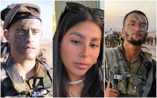 الرقيب أول أوهاد دهان (20 عاما)، في الصورة من اليسار، والرقيب ليا بن نون (19 عاما)، في الصورة في الوسط، والرقيب أول أوري يتسحاق إيلوز (وسط)، جميعهم جنود مقاتلون في كتيبة “بارديلاس”، الذين قُتلوا في إطلاق نار على الحدود المصرية في 3 يونيو، 2023.