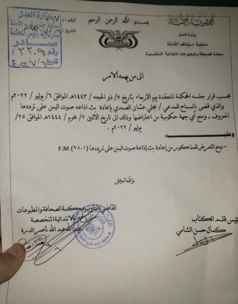 وعلى الرغم من صدور حكم قضائي لصالح الإذاعة يقضي بعودة البث وتعويض مالكها عن الأضرار المادية الناجمة عن التوقف، إلا أن قوة النفوذ تغلبت على سلطة القضاء. الأمر الذي اضطر مدير الإذاعة، الصحفي مجلي الصمدي، إلى مغادرة صنعاء والانتقال مع أسرته إلى مناطق سيطرة الشرعية، بعد أن تعرض لاعتداءات متكررة وتهديدات مباشرة من قبل الجماعة.