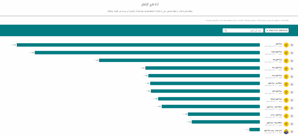 وقد تصدرت “حركة حقوق” – الجناح السياسي لكتائب حزب الله المصنفة إرهابيًا من قبل الولايات المتحدة الأمريكية – حجم الإنفاق الإعلاني خلال الفترة من 22 أيلول/سبتمبر 2025 ولغاية 21 تشرين الأول/أكتوبر 2025، حيث بلغ الإنفاق الإجمالي على صفحتها الرسمية 13,366 دولار أمريكي.