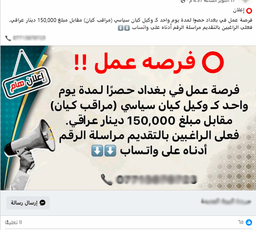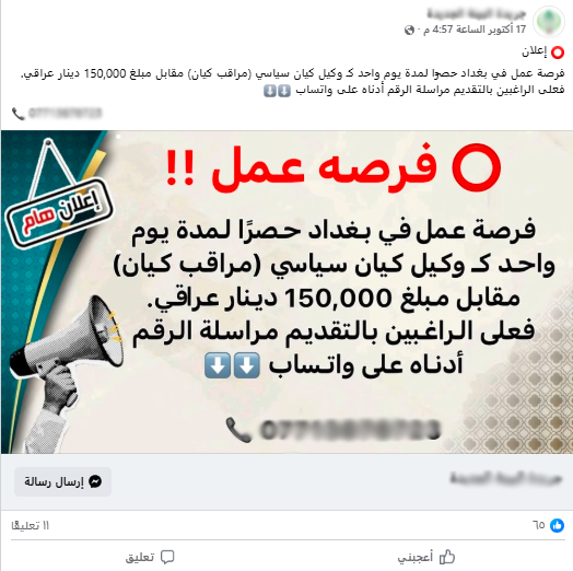أظهرت نتائج البحث في مواقع التواصل الاجتماعي تحديدًا منصة فيسبوك، عن عروض للعمل بصفة كيان سياسي لمراقبة سير العملية الانتخابية في محطات مراكز الاقتراع بأجور متفاوتة تتراوح بين 100 دولار إلى 300 دولار ليوم واحد فقط، وهذا ما يؤثر على نزاهة الانتخابات، وفي تصريح للمحلل السياسي علي حمزة أشار إلى أنّ “ما يعصف بالعملية الديمقراطية هو استغلال بعض الكتل السياسية للمراقبين حيث تستمد قوتها الانتخابية من خلال تسويق نفسها عبر شراء ذمم مراقبين داخل مراكز الاقتراع، كما لا يوجد تدقيق فعلي من قبل المفوضية العليا المستقلة للانتخابات على قراراتها المتعلقة بالدعاية الانتخابية”.