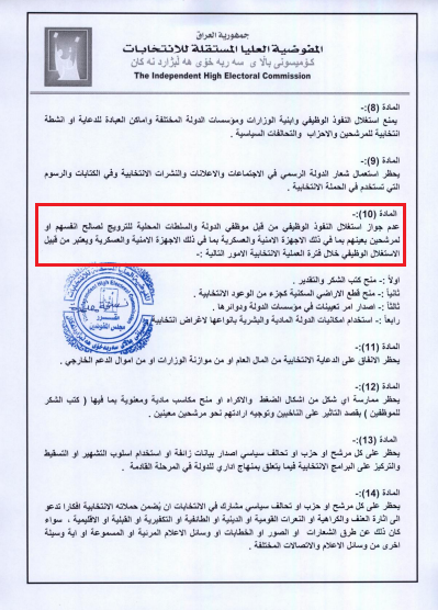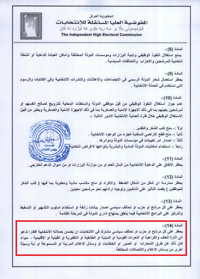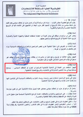 إلا أنّ هذا المادة تشهد خرقً علنيًا، حيث شارك النائب في مجلس النواب العراقي ومرشح ائتلاف الإعمار والتنمية عبد الأمير المياحي، بتأريخ 20 تشرين الأول 2025، عبر صفحته في منصة فيسبوك، منشورًا جاء فيه: “في حسينية الحاج محسن حاتم المياحي، اجتمع أبناء مياح بيت علوان بدعوة من الشيخ عيدان المياحي، حيث أعلنوا دعمهم الكامل والثابت للنائب عبدالأمير نجم المياحي في الانتخابات البرلمانية المقبلة، مؤكدين أنه ممثلهم الوحيد وصوتهم الصادق تحت قبة البرلمان”.