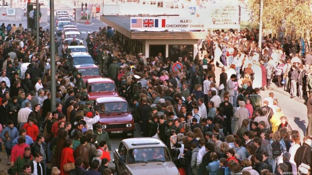 تدفق الناس إلى نقاط العبور بين شطري برلين المنقسمة، وكانت الفرحة بلا حدود حرفياً. قال أحد مواطني ألمانيا الشرقية آنذاك بسعادة: “حتى قبل قليل، كانوا يسمحون لنا بالعبور واحداً تلو الآخر، ثم فتحوا البوابة، والآن يمكننا جميعاً المرور دون جوازات سفر، دون أي شيء. لا يوجد أي تفتيش. حتى إنني لا أحمل بطاقة هوية معي.”