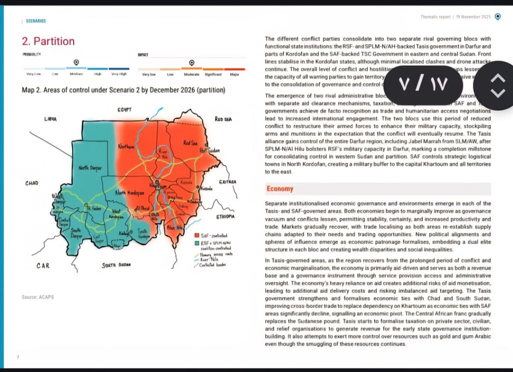 التقسيم كتلتان حاكمتان وبيئتان للمساعدات يرسم السيناريو الثاني مساراً يقود إلى انقسام فعلي للبلاد إلى كتلتين حاكمتين: حكومة “تأسيس” المدعومة من قوات الدعم السريع والحركة الشعبية/الشمال بقيادة الحلو، والمسيطرة على غرب السودان. وحكومة مجلس السيادة الانتقالي المدعومة من القوات المسلحة، في الشرق والوسط. تستقر الجبهات نسبياً، وتنشأ منظومتان منفصلتان للتصاريح والضرائب والتسجيل، ما يخلق بيئتين متوازيتين للمساعدات الإنسانية. ومع تراجع العنف، يتحسن الوصول الإنساني تدريجياً، بينما يشهد الاقتصاد تعافياً محدوداً. وعلى الجانب الآخر، يعود اقتصاد مناطق “تأسيس” للاعتماد الكبير على المعونات، مع احتمالات التحول إلى استخدام الفرنك الأفريقي المركزي بدلاً من الجنيه السوداني.