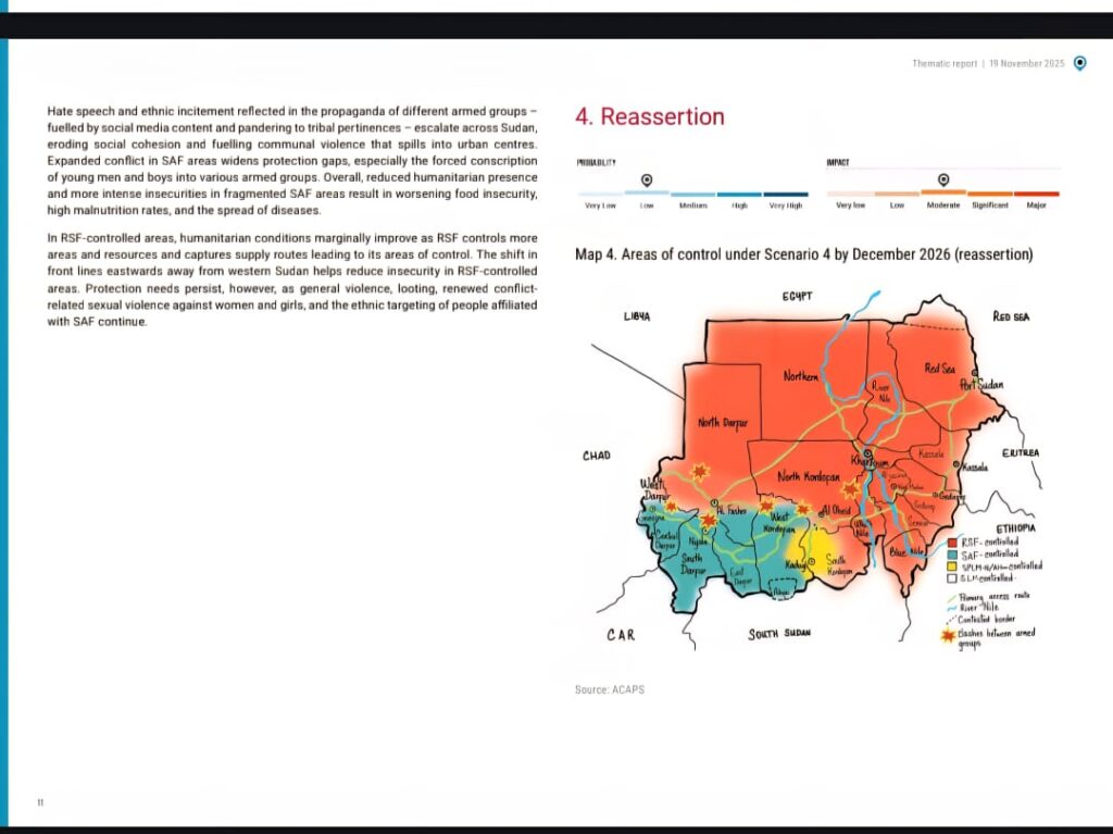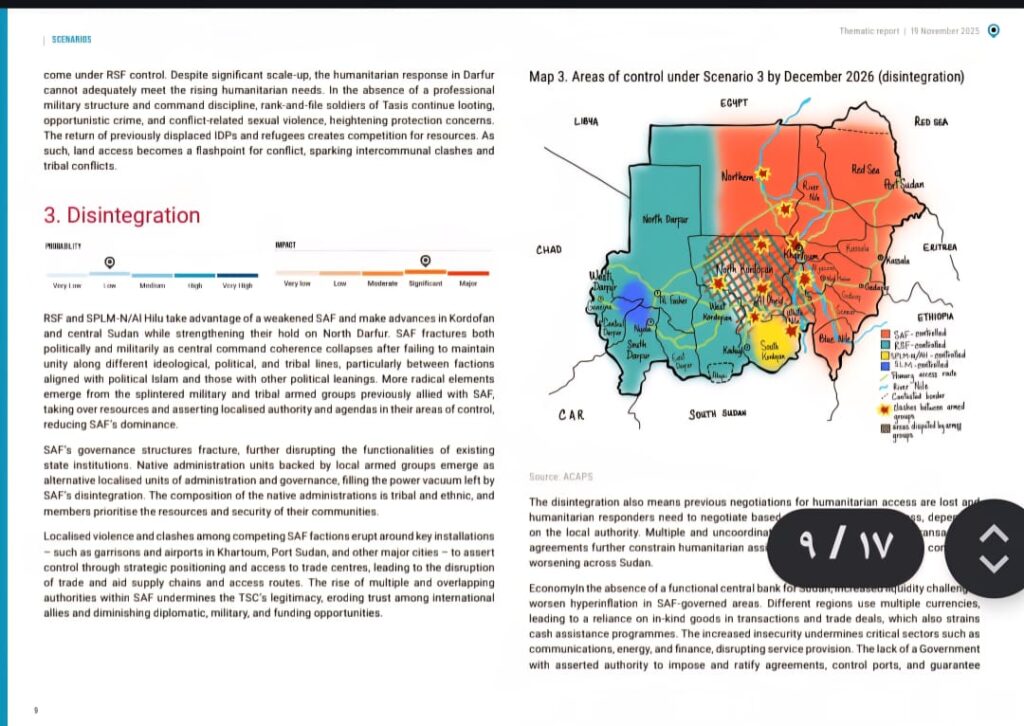 أصدرَت شبكة ACAPS لتحليل النزاعات والاحتياجات الإنسانية، تحليلاً استباقياً شاملاً يرسم ملامح أربعة سيناريوهات تحدد مستقبل السودان خلال العام المقبل، في ظل التحولات السريعة في خارطة السيطرة العسكرية وتعقّد بيئة الحوكمة. التقرير، الذي يستهدف صناع القرار الإنساني، يقدم قراءة معمّقة لتداعيات النزاع على الاقتصاد، والخدمات الأساسية، ووصول المساعدات، وتوازن القوى داخل البلاد حتى ديسمبر 2026.