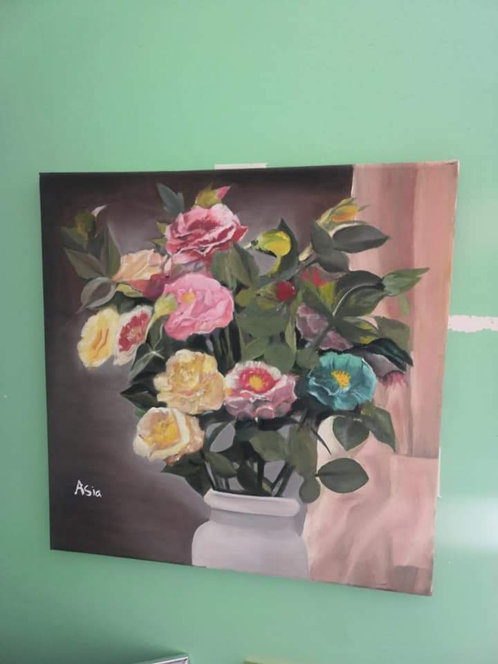 آسيا الشابة الخجولة بطبعها، الكريمة في حديثها، المثقفة حين تتحاور معها، المخلصة في عملها، لا تكاد تستسلم لتقلبات الحياة ولا لانتكاس وضعها الصحي بين حين وآخر، لكنها ما تزال تشعّ حبًا وشغفًا وأملًا بأن القادم أجمل. شعارها الرضا بما كُتب لها، والاقتناع بأن إعاقتها منحة ربانية صنعت منها فنانة مرهفة الإحساس تجسد لنا لوحات تحكي قصصًا من الإبداع والسلام.