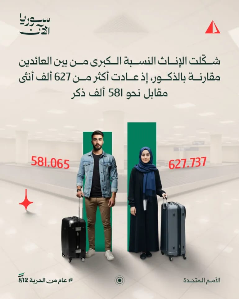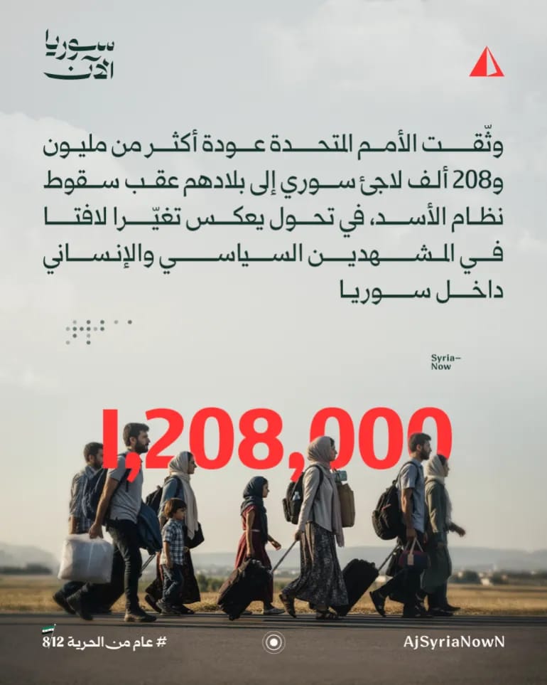 أكثر من 1.208 مليون لاجئ سوري عادوا إلى وطنهم بعد تحرير البلاد في ديسمبر 2024، وفقًا لتوثيق الأمم المتحدة (بتاريخ 5 ديسمبر 2025).
