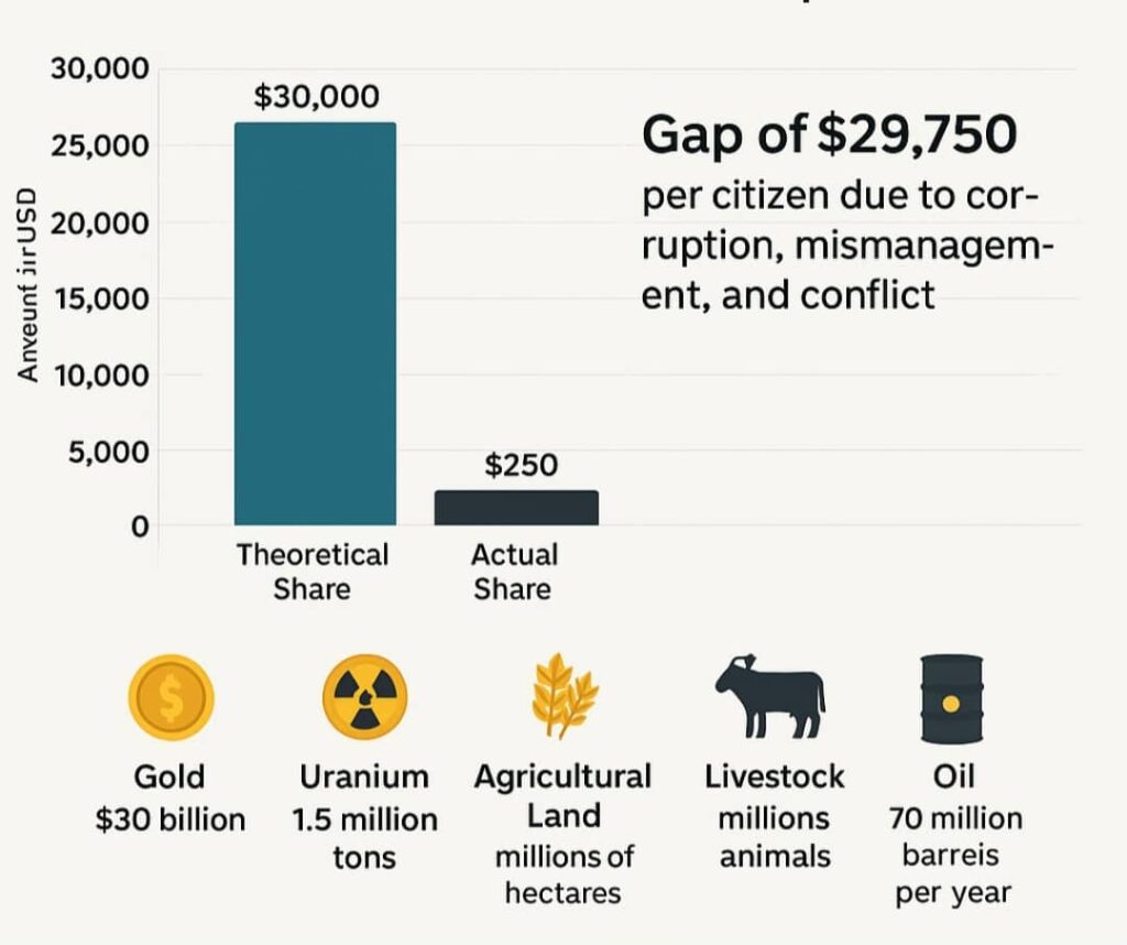 يختزن ثروات هائلة تكفي كل مواطن لحياة كريمة بعشرات آلاف الدولارات سنويًا، من الذهب واليورانيوم والحديد والفوسفات والسيليكا والمعادن المختلفه.. إلى الأراضي الزراعية والثروة الحيوانية والموارد المائية.
