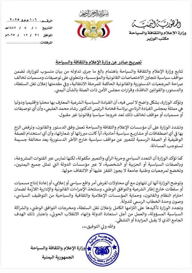 في سابقة سياسية قد تكون الأخطر منذ تشكيل مجلس القيادة الرئاسي، أعلن عدد من الوزراء ونواب الوزراء المحسوبين على الانتقالي -وهم جزء من القوام الرسمي للحكومة- تأييدهم الصريح لمشروع “فك الارتباط” وإقامة دولة الجنوب. هذا الانقسام الرأسي دفع بوزارة الإعلام والثقافة والسياحة إلى إصدار بيان حاد، وصفت فيه تلك المواقف بأنها “خروج سياسي وقانوني غير مقبول”، محذرة من توظيف مؤسسات الدولة لخدمة مشاريع تشطر الهوية الوطنية، إذ يرى مراقبون أن هذا “الشرخ” الحكومي يجعل من إدارة الدولة مهمة شبه مستحيلة، حيث تتحول قاعة اجتماعات مجلس الوزراء إلى ساحة للمناورة السياسية بدلاً من حل أزمات المواطنين المعيشية.