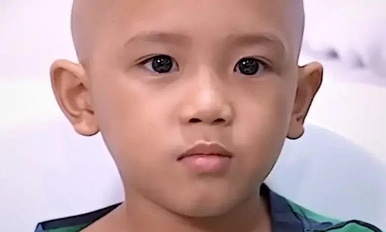 طفل صغير يواجه الكاميرا. بشرته شاحبة ورأسه حليق.