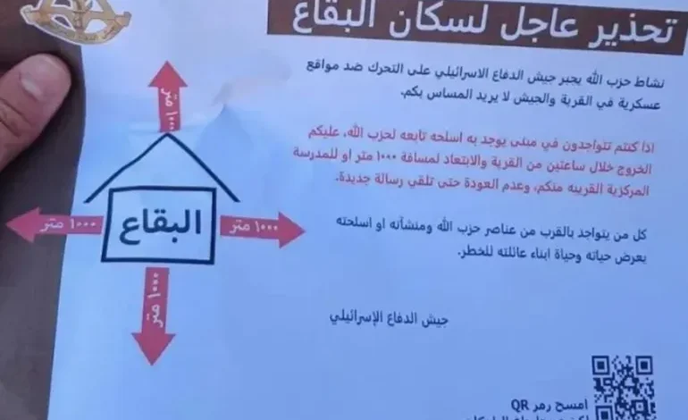 حذر حزب الله اللبناني سكان سهل البقاع شرقي لبنان من منشورات تُسقطها إسرائيل تحتوي على رمز تعريفي “الباركود” وصفه بالخطير جدا.