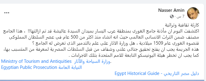 وقال ناصر أمين في منشوره: “اكتشفت اليوم أن مأذنة جامع الغوري بمنطقة عرب اليسار بميدان السيدة عائشة قد تم ازالتها!! ، هذا الجامع مصنف ضمن التراث الانسانى العالمى حيث أنه أنشئ منذ اكثر من 500 عام فى عصر السلطان المملوكى قنصوه الغورى عام 1509 ميلادية”.