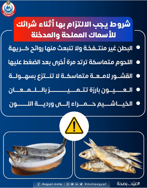 و حذرت وزارة الصحة والسكان المصرية من تناول الأسماك المملحة، حتى المعد منها منزلياً، بسبب عدم وجود طريقة تضمن سلامة هذه الأسماك وخلوها من البكتيريا اللاهوائية.