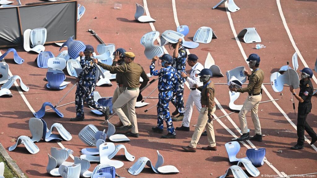 تحولت جولة لاعب كرة القدم الأرجنتيني ليونيل ميسي، للهند أمس السبت إلى فوضى عارمة، بعد أن أقدم مشجعون غاضبون على إلقاء الزجاجات والكراسي ومقذوفات أخرى أحد الملاعب الهندية.