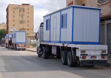 اصطفاف شاحنات تحمل منازل متنقلة بمعبر رفح تمهيدا لدخول غزة