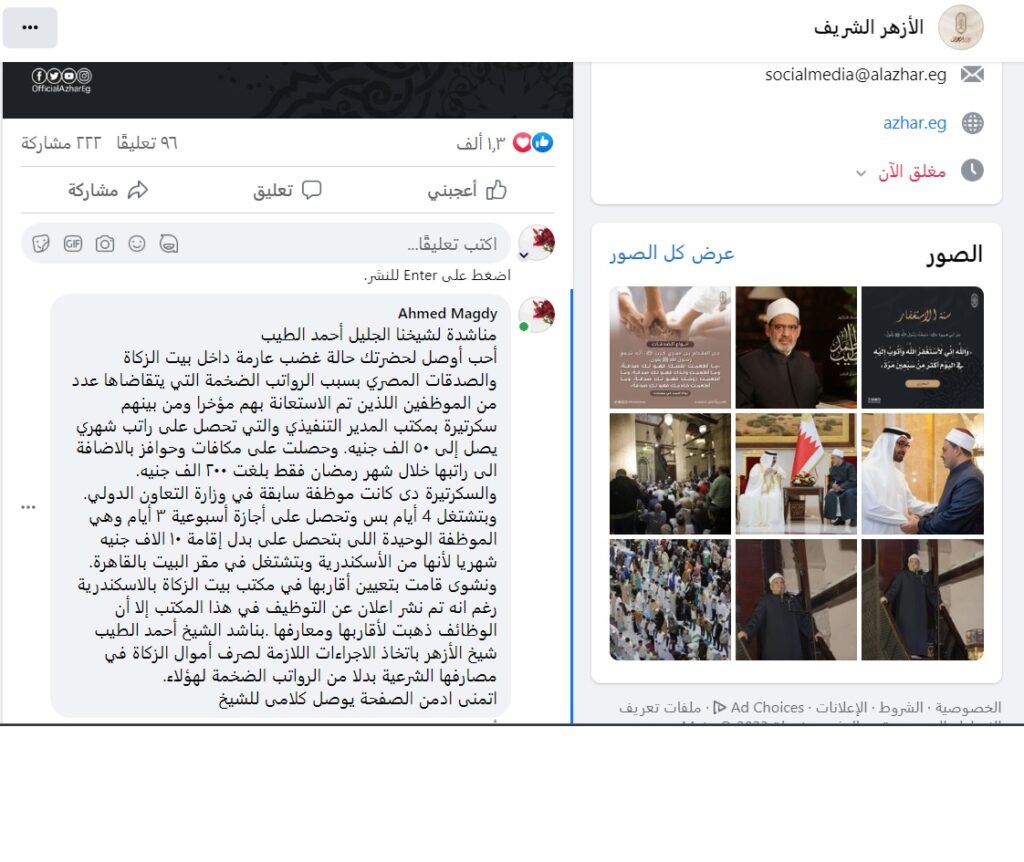 وناشد رواد الفيس بوك الشيخ أحمد الطيب شيخ الأزهر باتخاذ الإجراءات اللازمة لصرف أموال الزكاة في مصارفها الشرعية بدلا من الرواتب الضخمة .