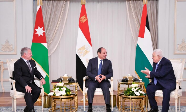 استضاف الرئيس عبد الفتاح السيسي، في قمة ثلاثية، صاحب الجلالة الهاشمية الملك عبد الله الثاني ابن الحسين ملك المملكة الأردنية الهاشمية، والرئيس محمود عباس رئيس دولة فلسطين، في العلمين اليوم الثلاثاء، ١٤ أغسطس/ ۲۰۲۳، لبحث تطورات القضية الفلسطينية في ضوء المستجدات الراهنة في أرض دولة فلسطين المحتلة، والأوضاع الإقليمية والدولية المرتبطة بها.