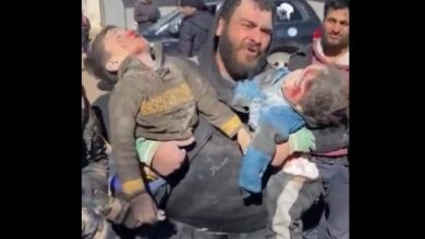 فيديو|سوري يحمل جثمان طفليه الصغيرين بعد استخراجهما من بين أنقاض الزلزال