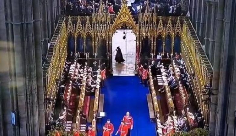 وثقت الكاميرات ما يشبه الشبح أو “ملاك الموت” كما يتصورونه في الغرب، يحمل مهبالا، خلال مراسم تتويج شارلز الثالث ملك بريطانيا أمس السبت.